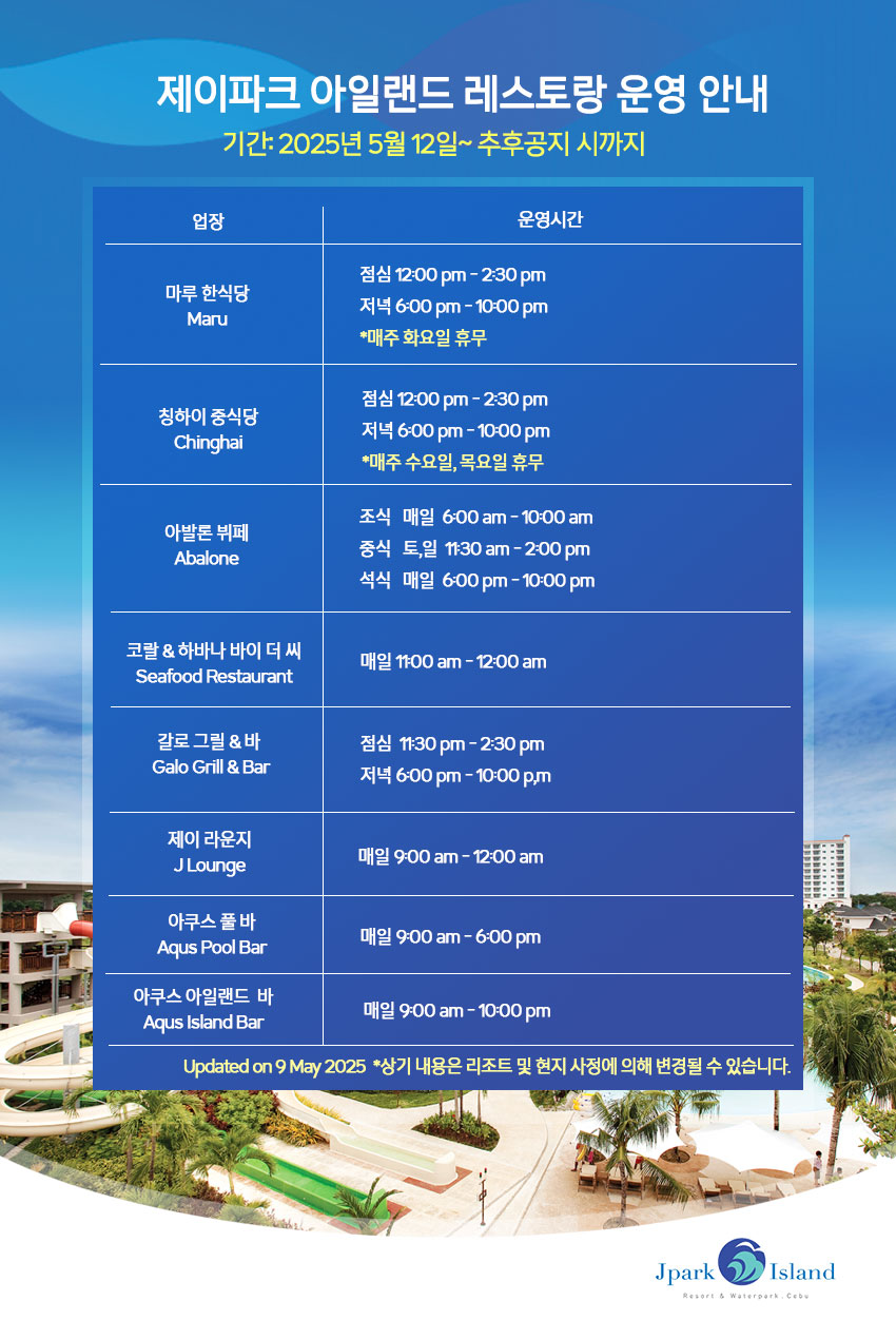 제이파크 아일랜드 레스토랑 운영시간 안내